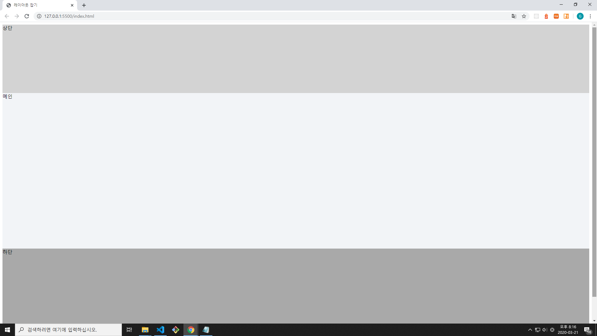 main 영역의 하위 요소들의 크기에 따라 height가 유연하게 결정됩니다. 위의 코드에서는 하위 요소가 없고 '메인'이라는 텍스트뿐이므로 main 영역이 해당 텍스트의 높이만큼만 공간을 차지하였습니다.