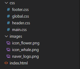 코드가 길어졌으니 아래 이미지와 같이 css파일들을 따로 분리시키고 마무리하겠습니다. 코드 분리 후에 index.html에서 <link> 태그로 해당 css 파일을 불러오시면 됩니다.
