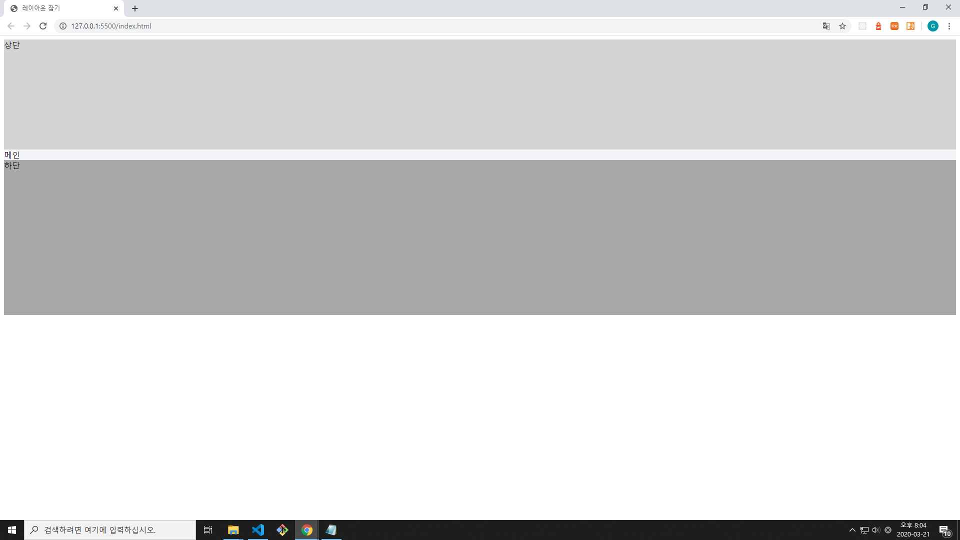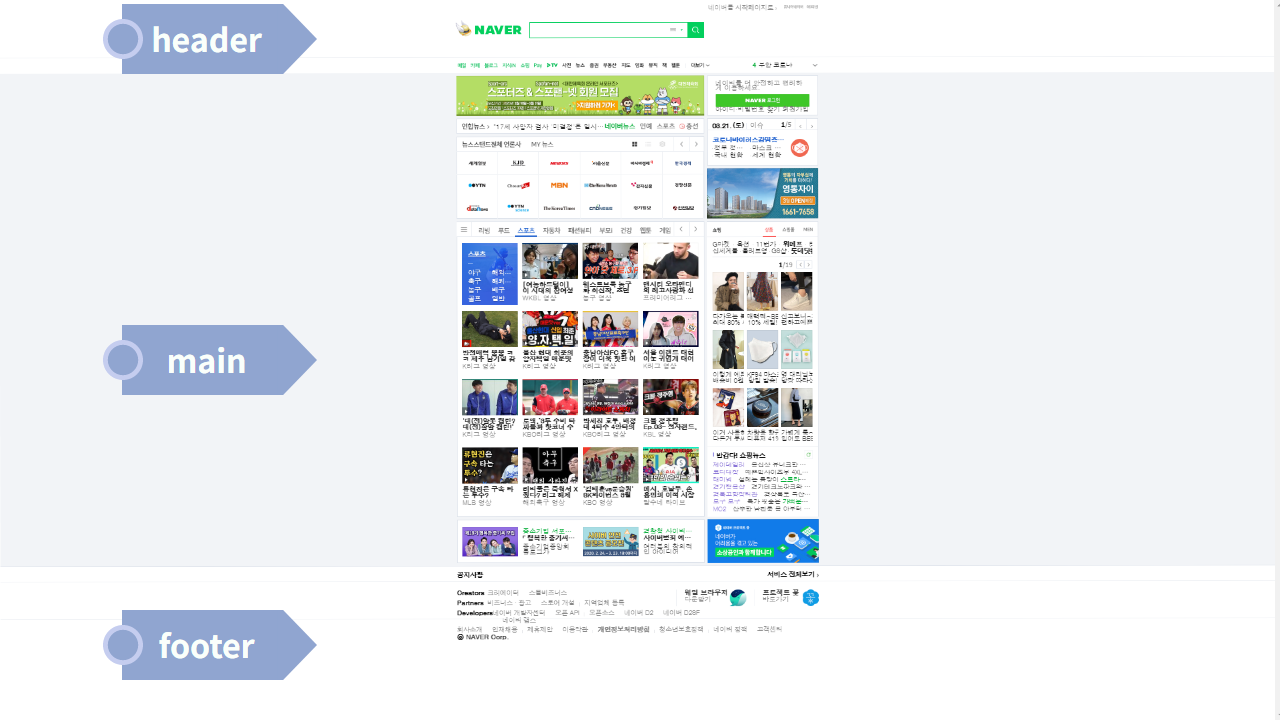 이렇게 3가지 영역을 잡았습니다. 앞서 말씀드렸듯이 main 영역은 배치할 하위요소들이 많기 때문에 다음 글에서 살펴보기로 하고, 이 글에서는 header와 footer를 네이버 사이트와 똑같이 만들어보겠습니다.