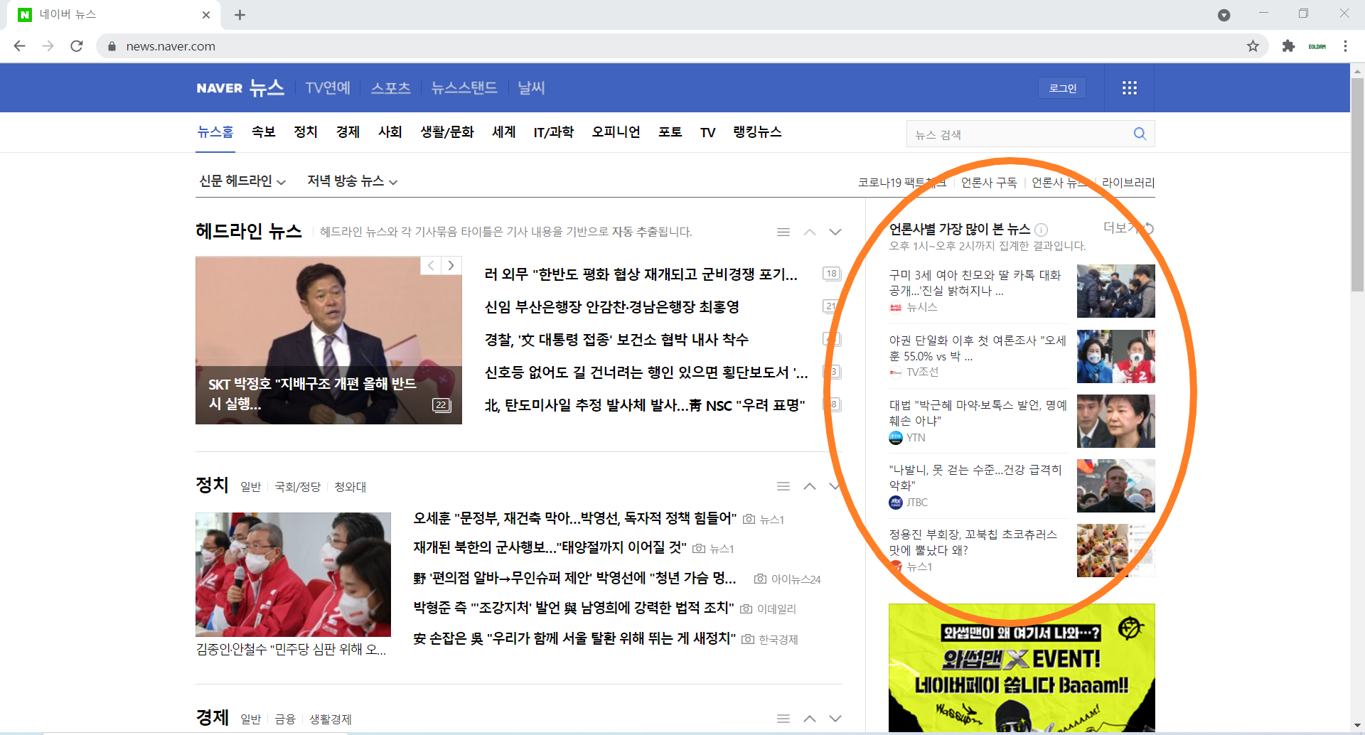 크롤링할 부분은 우측의 '언론사별 가장 많이 본 뉴스' 탭입니다.
