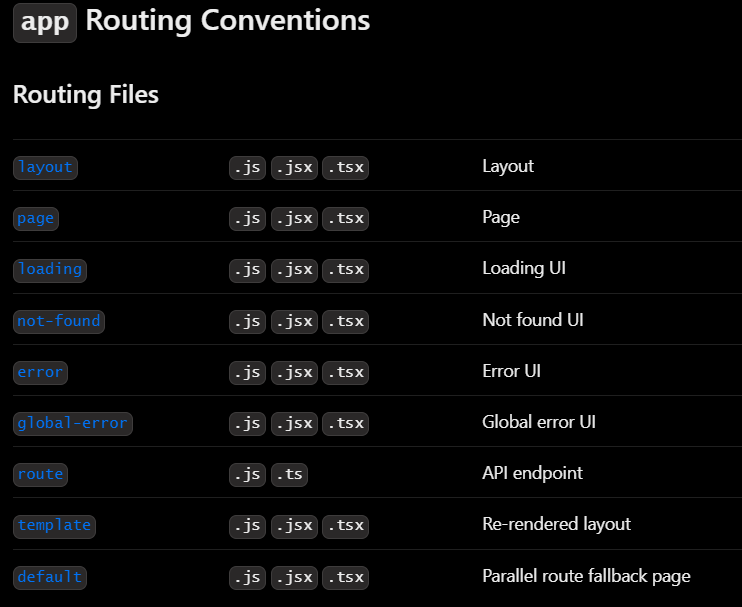 참고로 이미지에 있는 favicon.ico, globals.css와 같이 위의 Routing conventions에 없는 파일은 경로로 인식하지 않습니다.