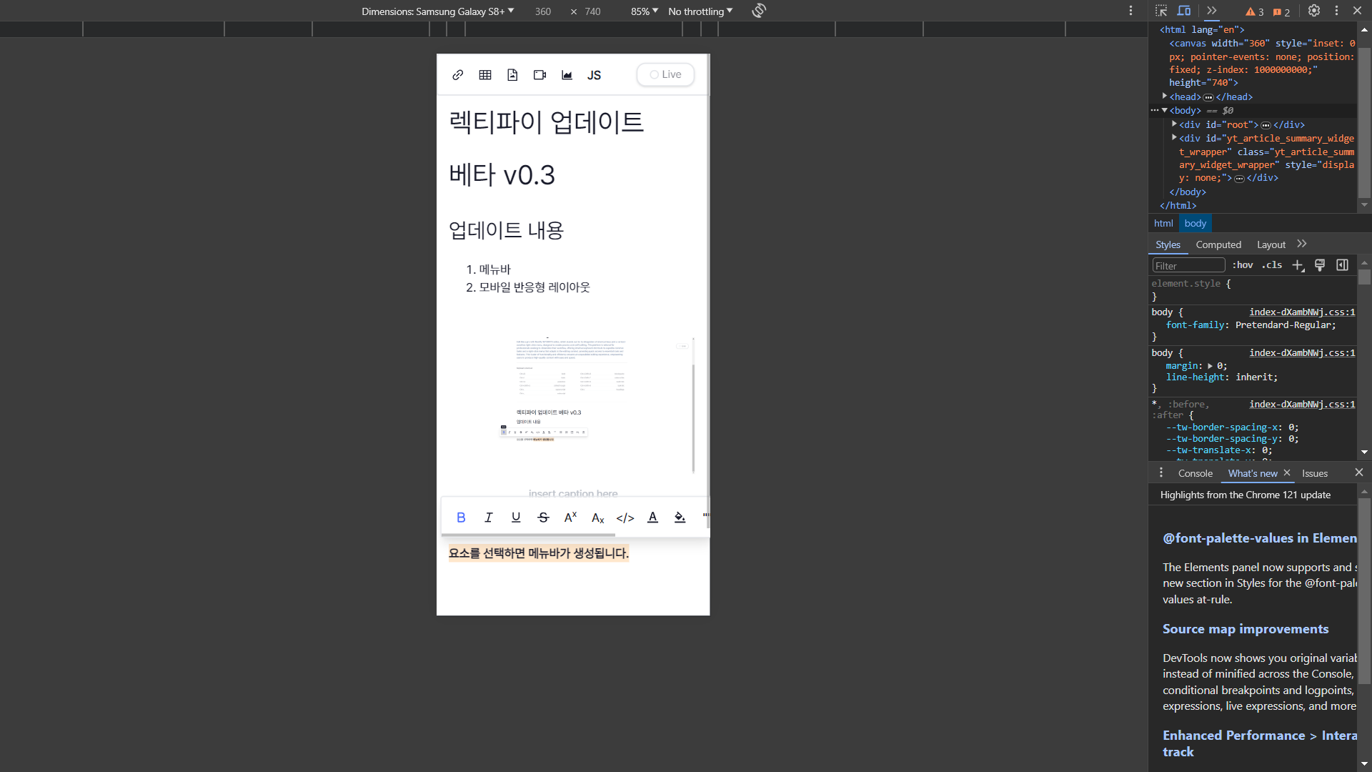 위치가 고정된 메뉴바 대신 노션처럼 마우스 커서에 따라 움직이는 버블 메뉴바를 추가했다. 기존에 콘텍스트 메뉴에 몰아두었던 기능들을 메뉴바에 분배하니 사용성이 조금 나아진 듯하다. 이미지, 차트 추가 등 커스텀 요소와 관련 있는 기능들은 콘텍스트 메뉴에 그대로 남겨두었고, 스타일 기능(볼드체, 기울임, 색상 등)들을 메뉴바로 옮겼다.