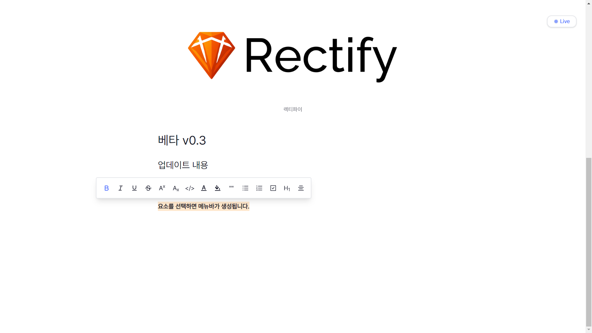 위치가 고정된 메뉴바 대신 노션처럼 마우스 커서에 따라 움직이는 버블 메뉴바를 추가했다. 기존에 콘텍스트 메뉴에 몰아두었던 기능들을 메뉴바에 분배하니 사용성이 조금 나아진 듯하다. 이미지, 차트 추가 등 커스텀 요소와 관련 있는 기능들은 콘텍스트 메뉴에 그대로 남겨두었고, 스타일 기능(볼드체, 기울임, 색상 등)들을 메뉴바로 옮겼다.