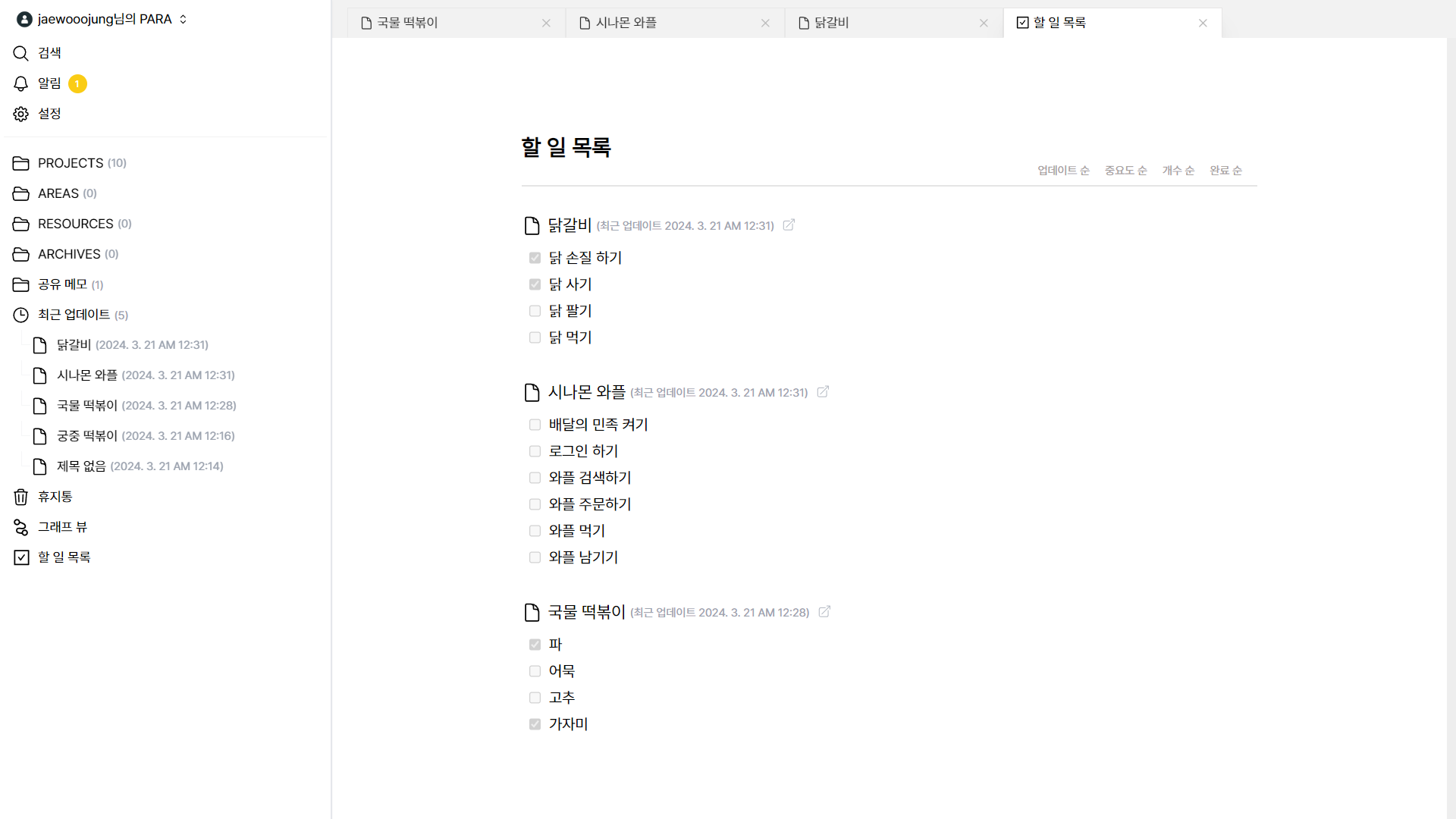 사이드바 내 '할 일 목록' 섹션을 통해, 사용자는 저장된 모든 메모의 할 일 목록을 쉽게 확인하고 정렬할 수 있습니다. 이 기능을 활용하여, 미처 관리하지 못한 투두리스트를 발견하거나, 다양한 프로젝트의 진행 상황을 한눈에 파악할 수 있습니다.