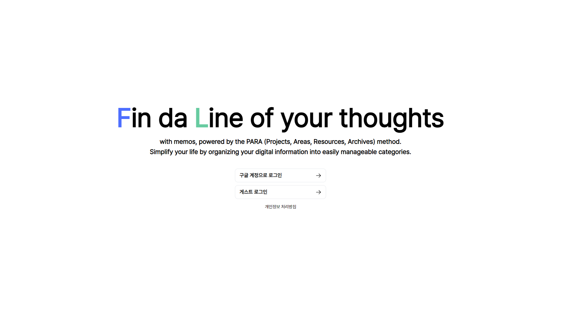 Findaline은 포트폴리오용으로 만든 메모 웹 애플리케이션입니다. PARA 메모법을 기반으로 하여, 사용자가 메모를 기록하고 정리할 수 있도록 디자인되었습니다. 또한, 기록된 메모를 효과적으로 활용할 수 있는 다양한 방안들을 고려하며 개발되었습니다.
