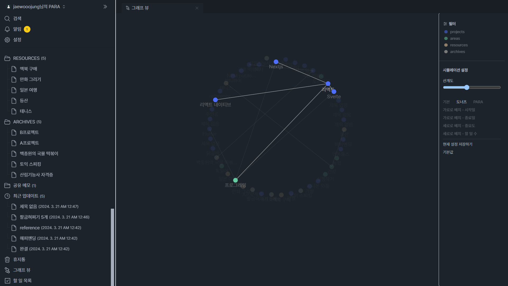우측 창을 통해 그래프 뷰의 세부 설정을 조정할 수 있습니다. 필터 기능을 사용하면, PARA 메모법에 따른 타입별로 노드를 선별하여 표시할 수 있습니다.