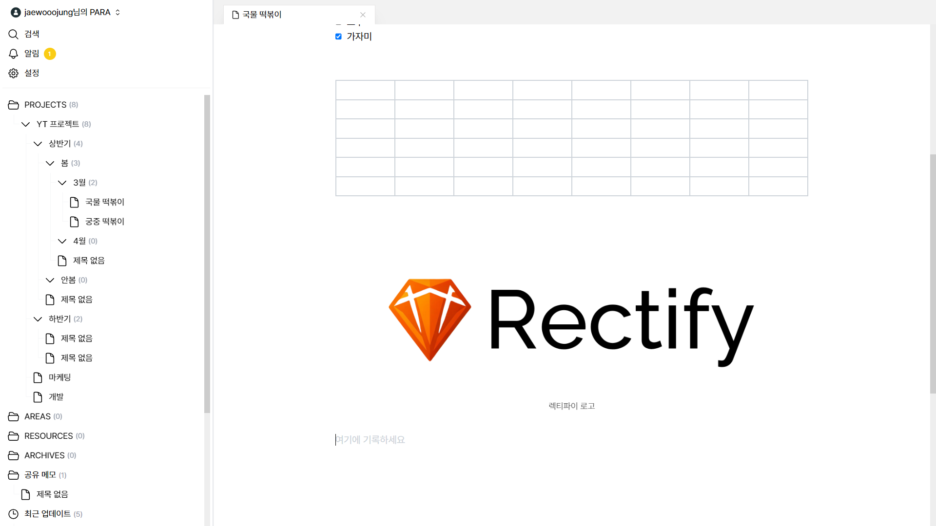 로그인 후 초기 진입 화면에서는 좌측에 사이드바가 출력됩니다. 사이드바의 디자인과 구성은 Notion의 인터페이스를 벤치마킹하였습니다.