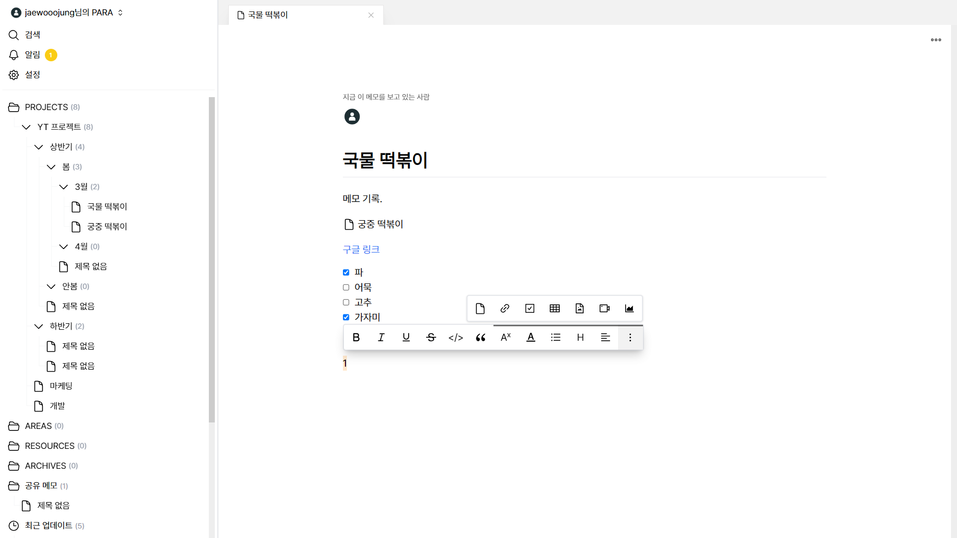 메모를 클릭하면 우측의 메인 화면에 에디터가 출력됩니다. 화면 상단에는 실시간으로 편집 중인 사용자들의 목록이 나타나며, 그 아래에는 메모 편집을 위한 WYSIWYG(What You See Is What You Get) 텍스트 에디터가 나타납니다.