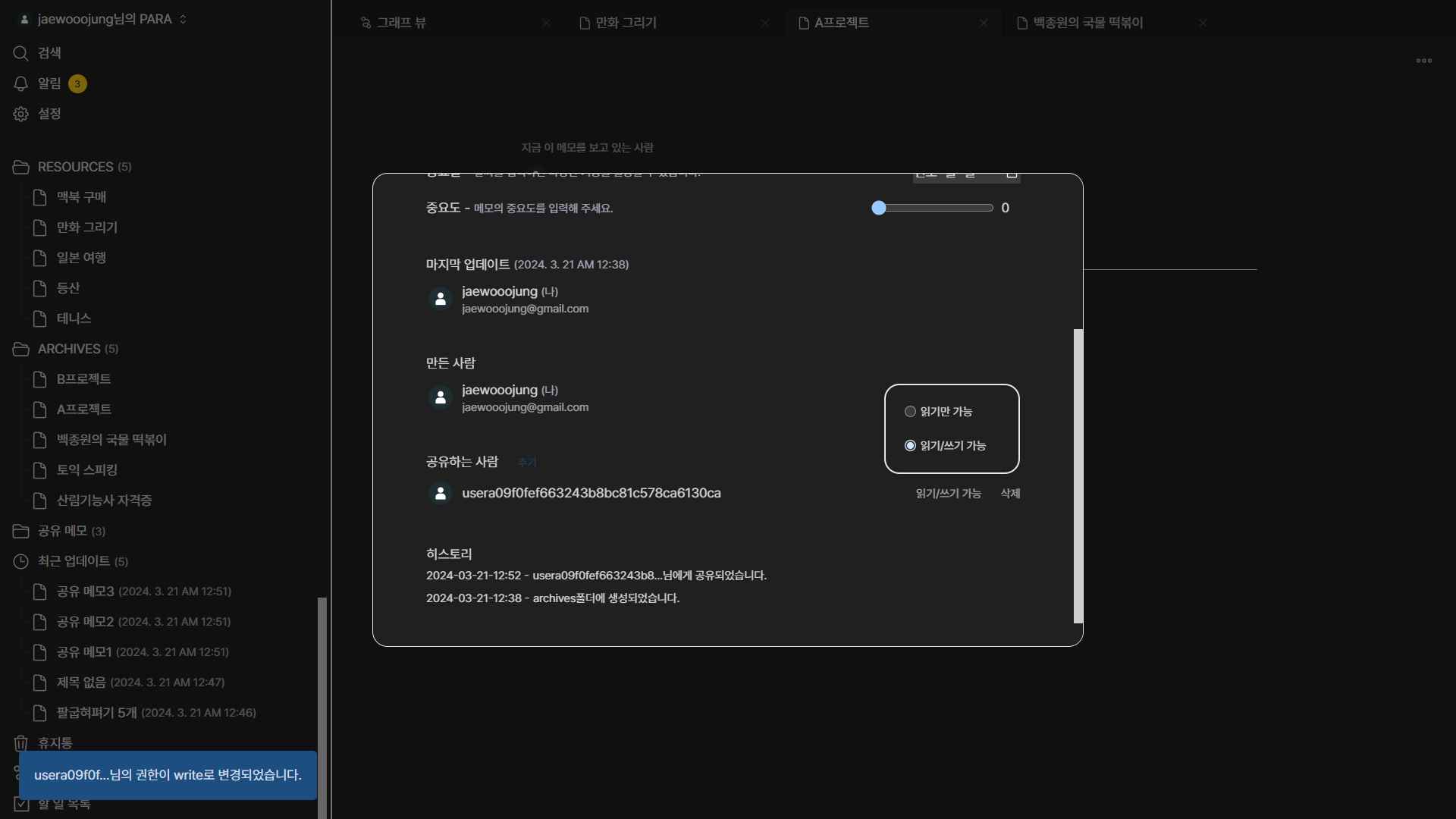 사용자는 메모 공유, 권한 변경 등에 대한 실시간 알림을 알림창에서 바로 확인할 수 있습니다. 이 기능을 통해 중요한 변경 사항이나 업데이트를 놓치지 않게 됩니다.