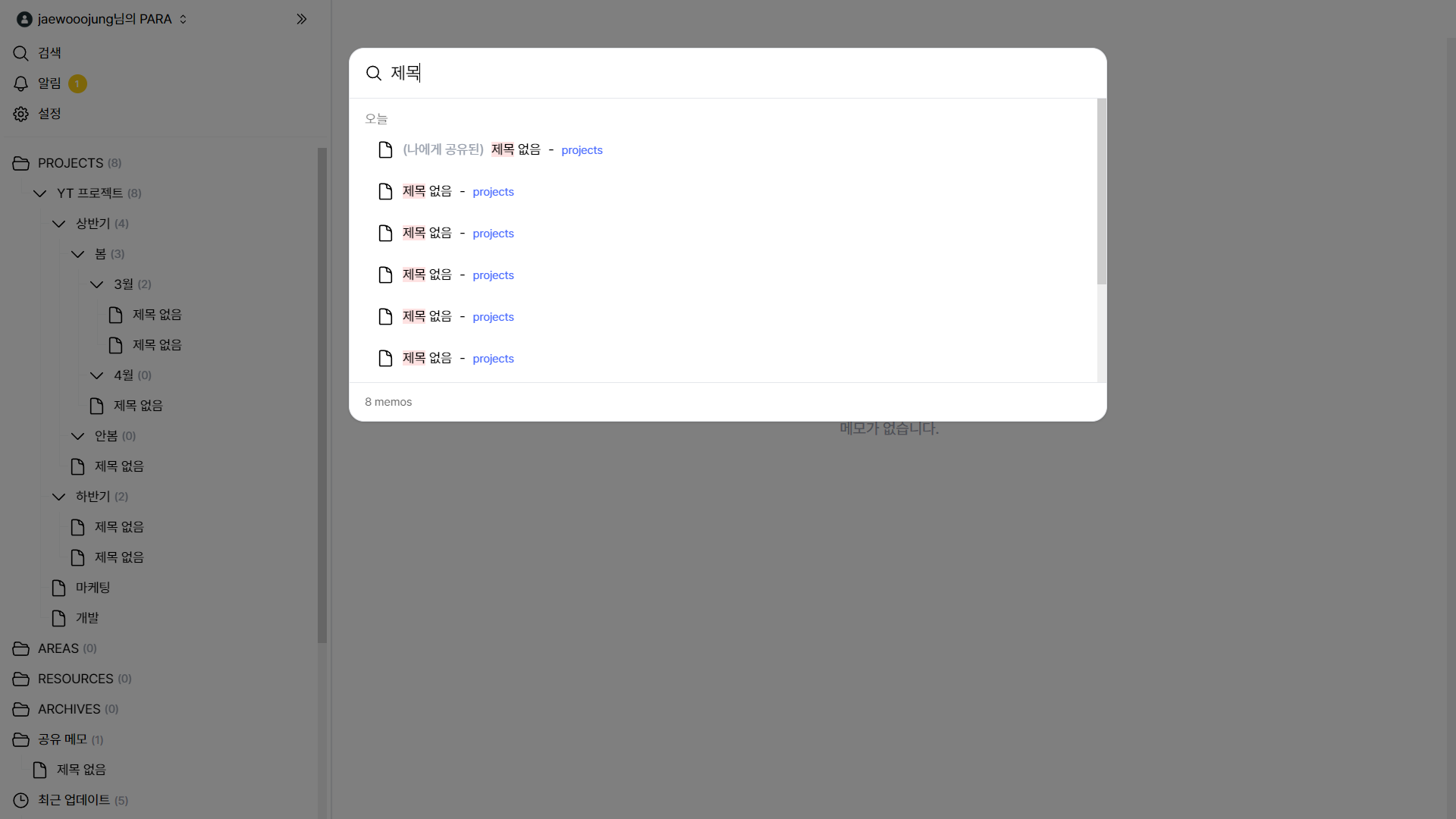 사용자는 사이드바 상단에 위치한 검색 버튼을 클릭하여 열리는 검색창을 통해 내 메모, 공유받은 메모, 휴지통에 있는 메모 등을 제목 기준으로 검색할 수 있습니다. 이 창의 인터페이스 역시 Notion을 벤치마킹하여 설계되었습니다. 검색 결과는 최근 업데이트 시간을 기준으로 '오늘', '어제', '1주 전', '한 달 전', '그 이전'으로 시간 순서에 따라 분류되어 표시됩니다.
