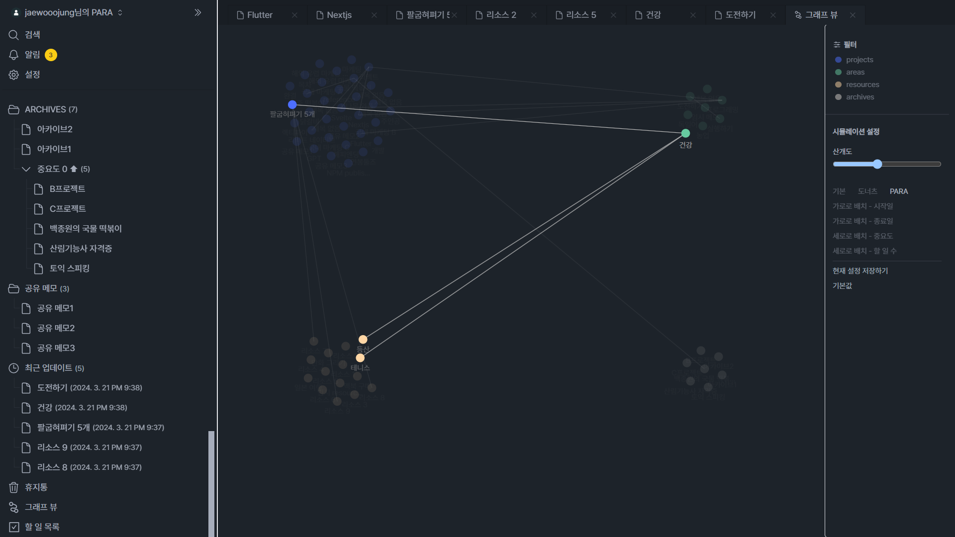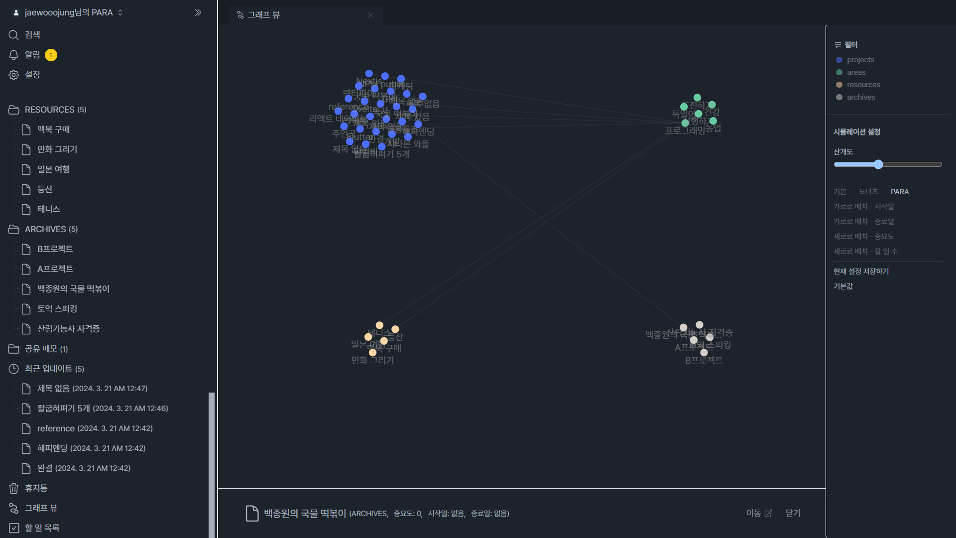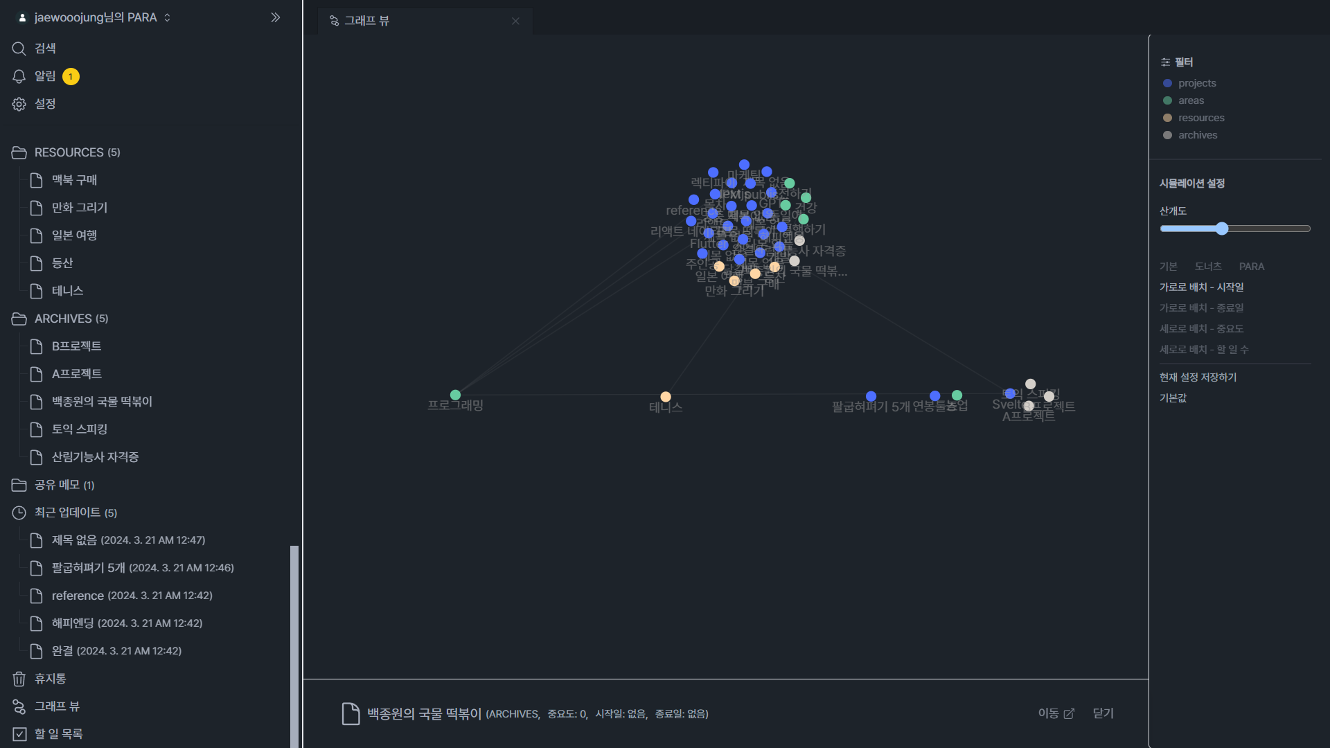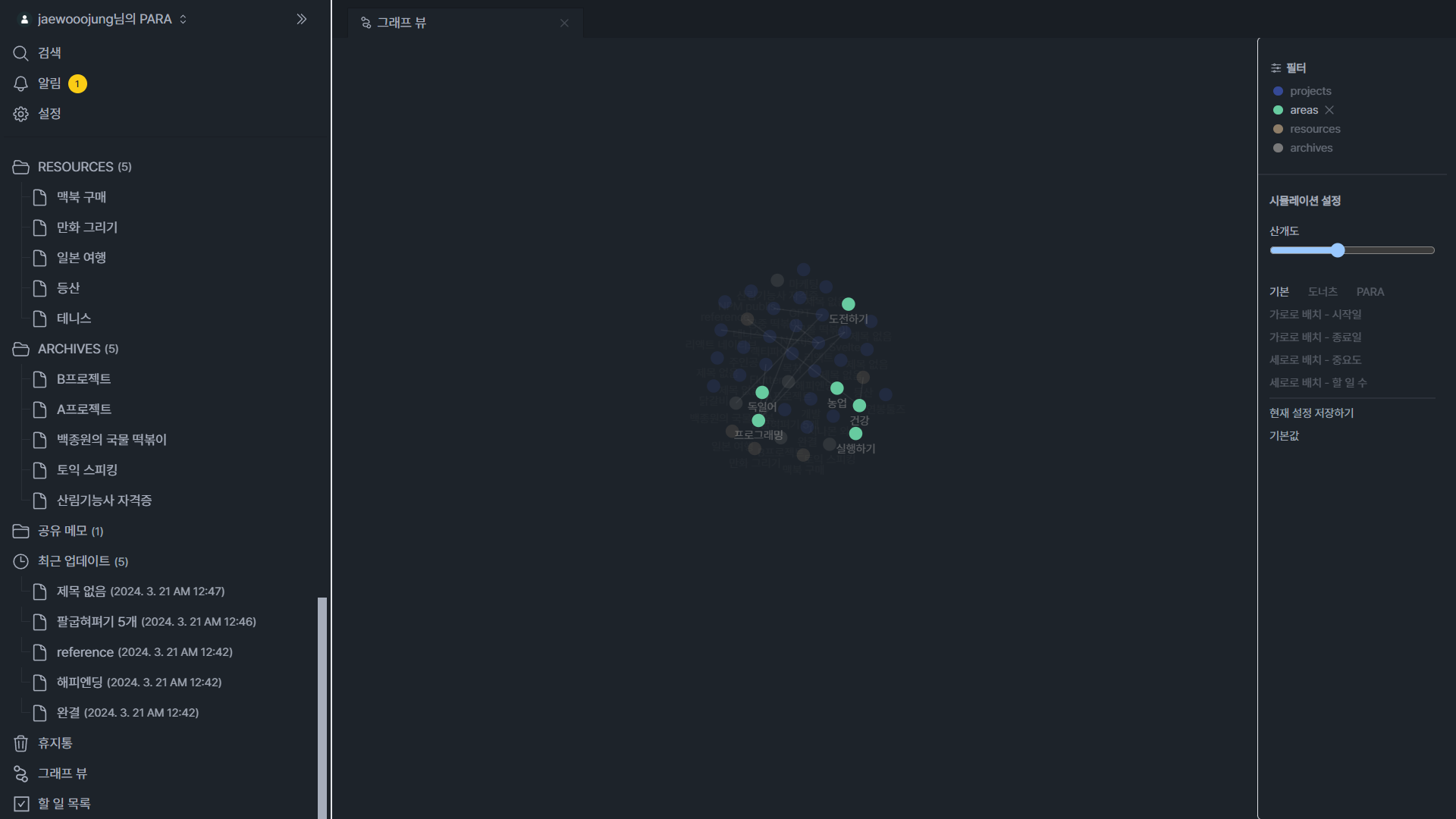 우측 창을 통해 그래프 뷰의 세부 설정을 조정할 수 있습니다. 필터 기능을 사용하면, PARA 메모법에 따른 타입별로 노드를 선별하여 표시할 수 있습니다.
