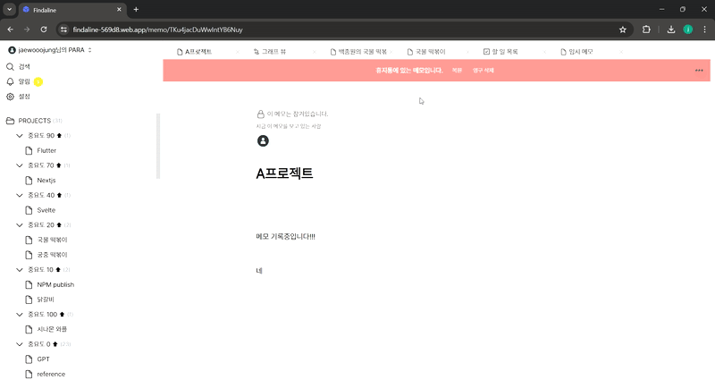 Findaline은 포트폴리오용으로 만든 메모 웹 애플리케이션입니다. PARA 메모법을 기반으로 하여, 사용자가 메모를 기록하고 정리할 수 있도록 디자인되었습니다. 또한, 기록된 메모를 효과적으로 활용할 수 있는 다양한 방안들을 고려하며 개발되었습니다.