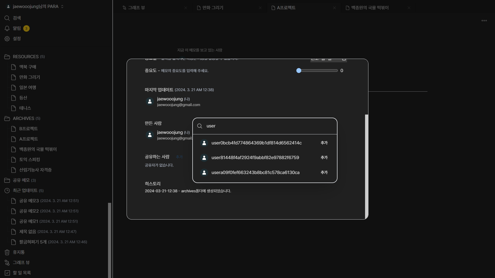 메모에 대한 기본 정보를 보여주며, 사용자는 여기서 메모 잠그기, 날짜 지정, 중요도 설정, 공유자 초대, 권한 조정 등 다양한 작업을 수행할 수 있습니다. 이렇게 설정된 정보들은 메모를 정렬하는 데 쓰이기도 하며, 아래에 소개할 '그래프 뷰' 화면에서 메모의 위치를 조정하는 기준이 되기도 합니다.