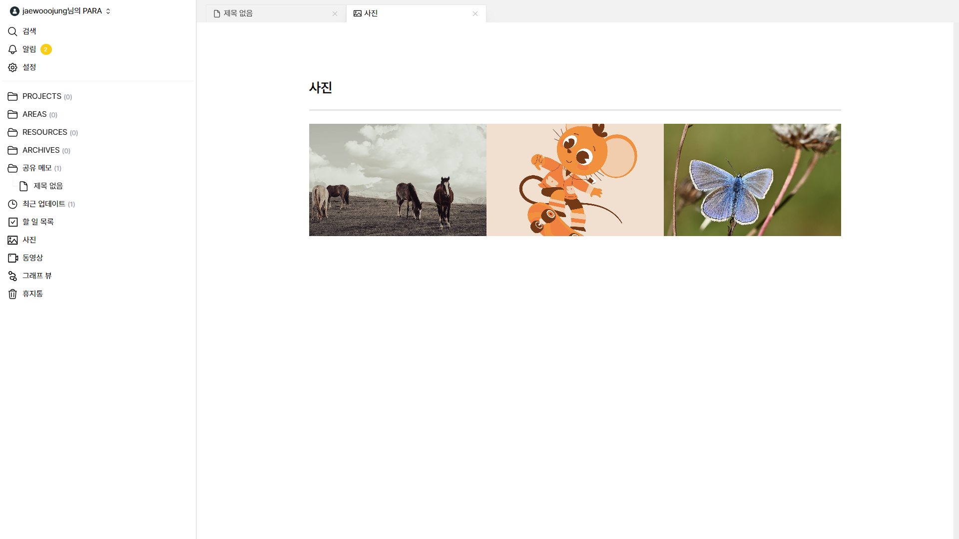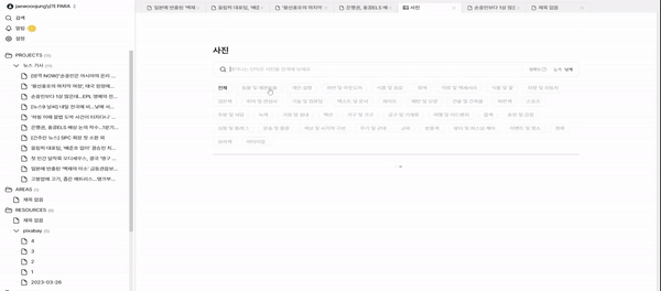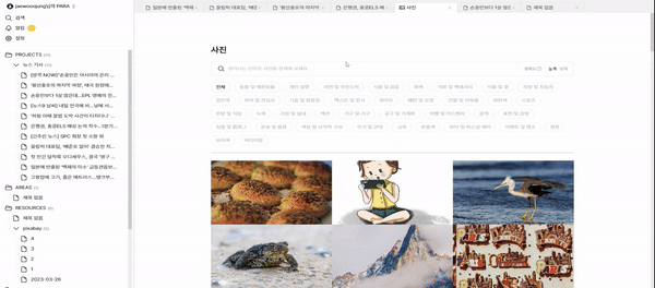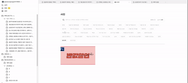 사이드바의 '사진 탭'을 통해 여러 메모에 분산되어 있는 모든 사진을 한 화면에서 확인할 수 있습니다.