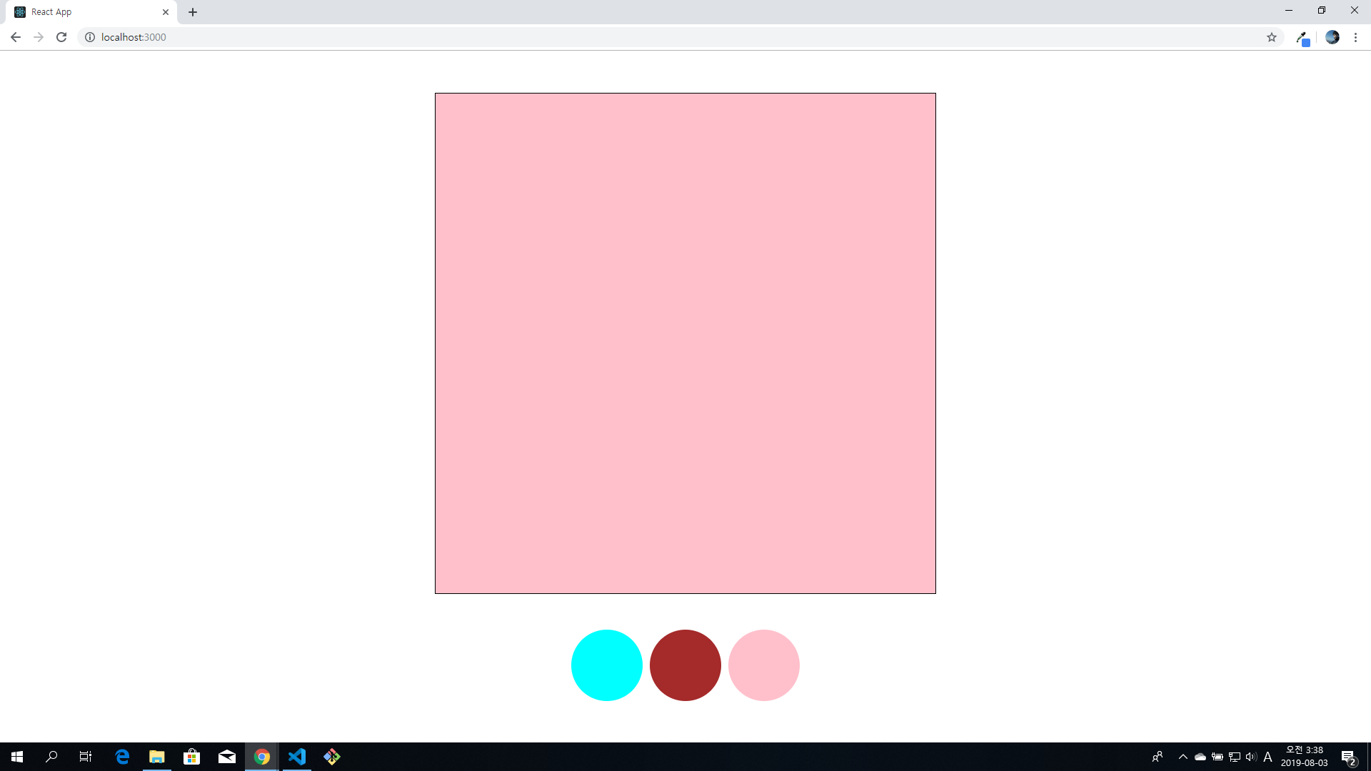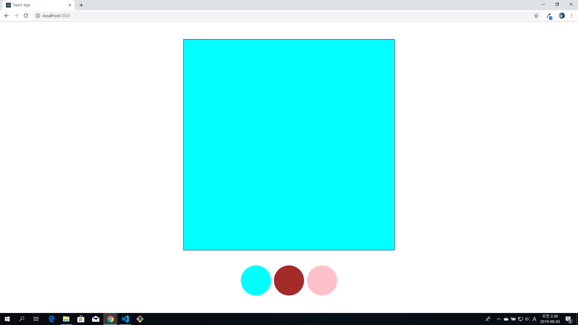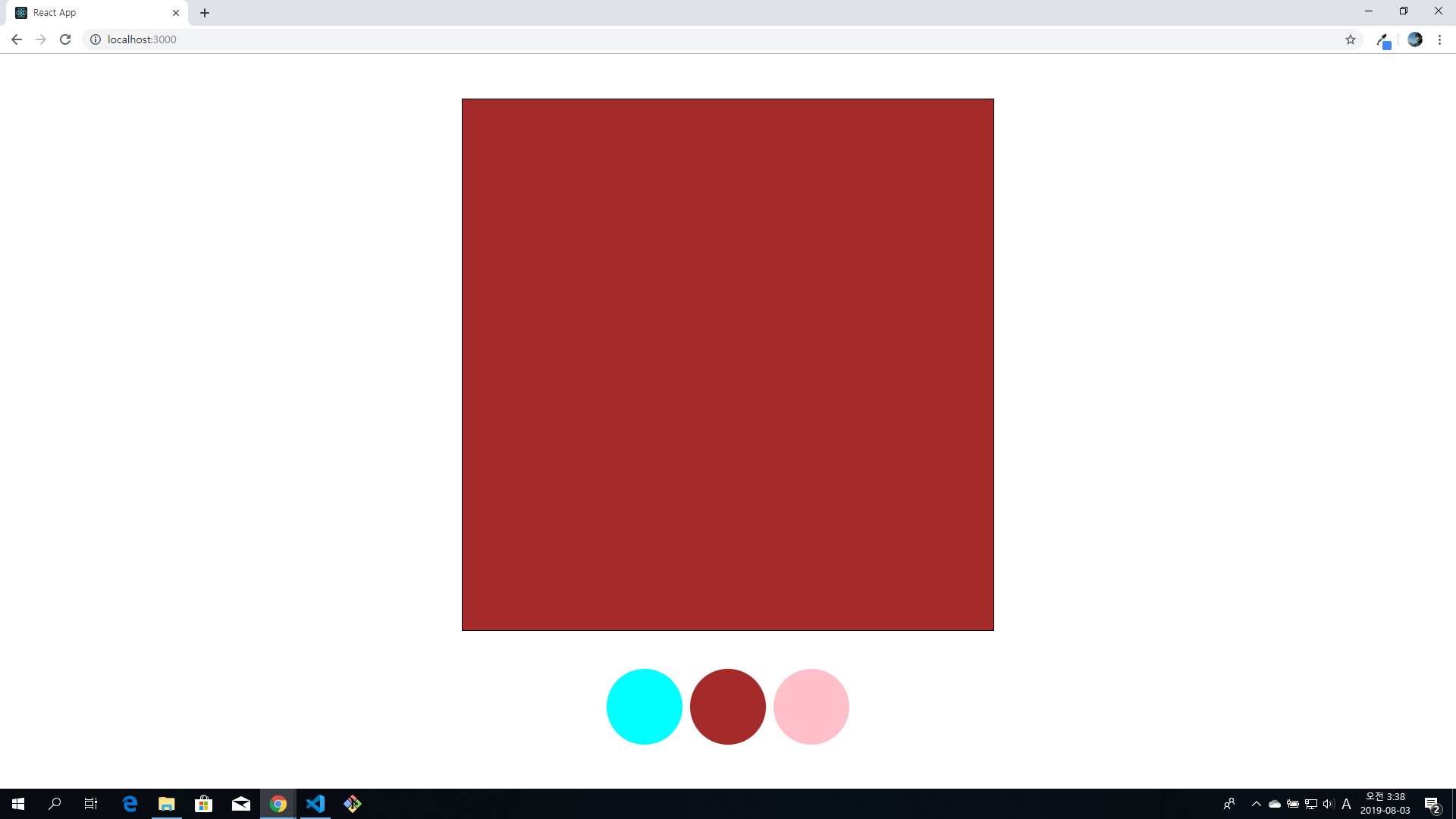 위의 사진들처럼 화면 아래쪽에 3개의 동그란 버튼을 누르면, 화면 중앙의 정사각형이 해당하는 버튼의 색으로 변경되는 예입니다.