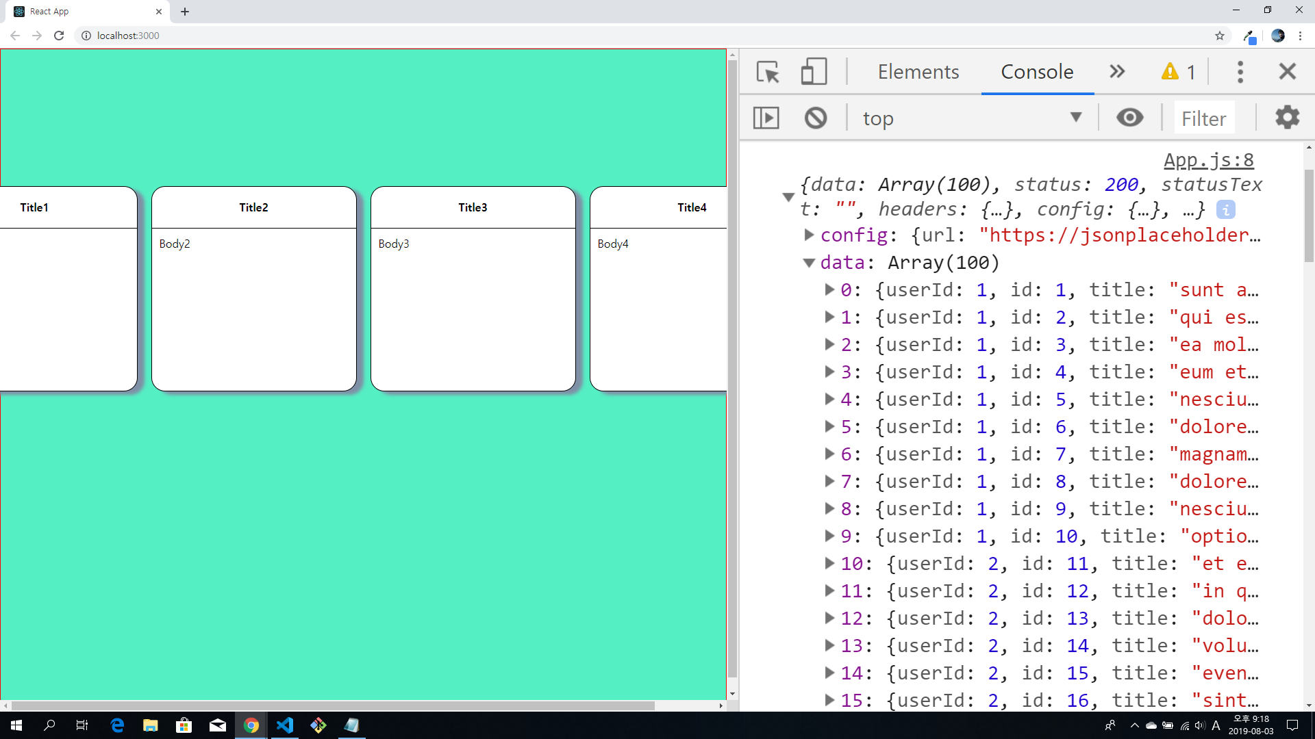 posts안에 있는 100개의 요소를 모두 출력하기 위해 자바스크립트의 Array.map() 메소드를 사용하였습니다.